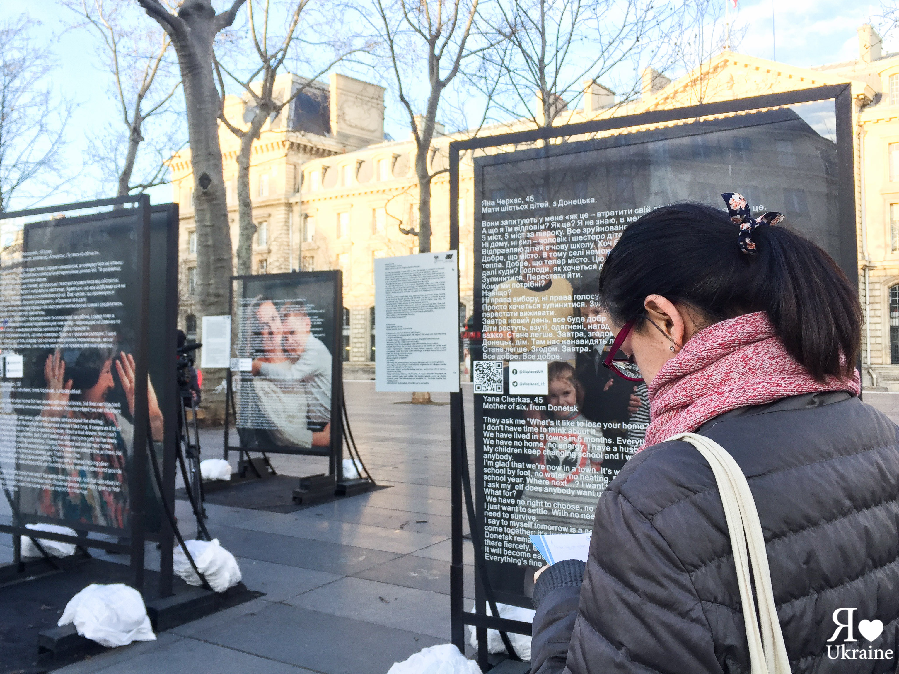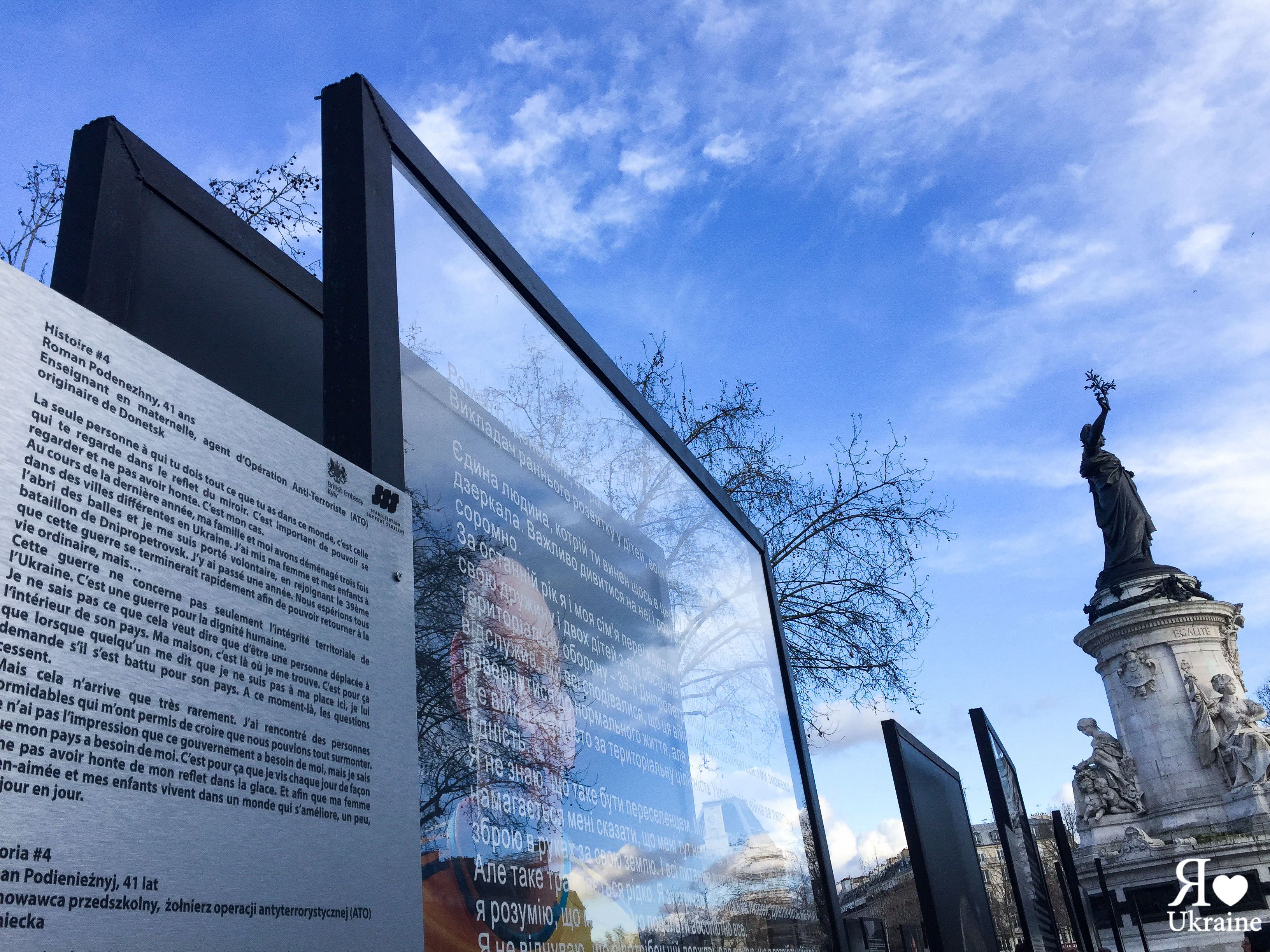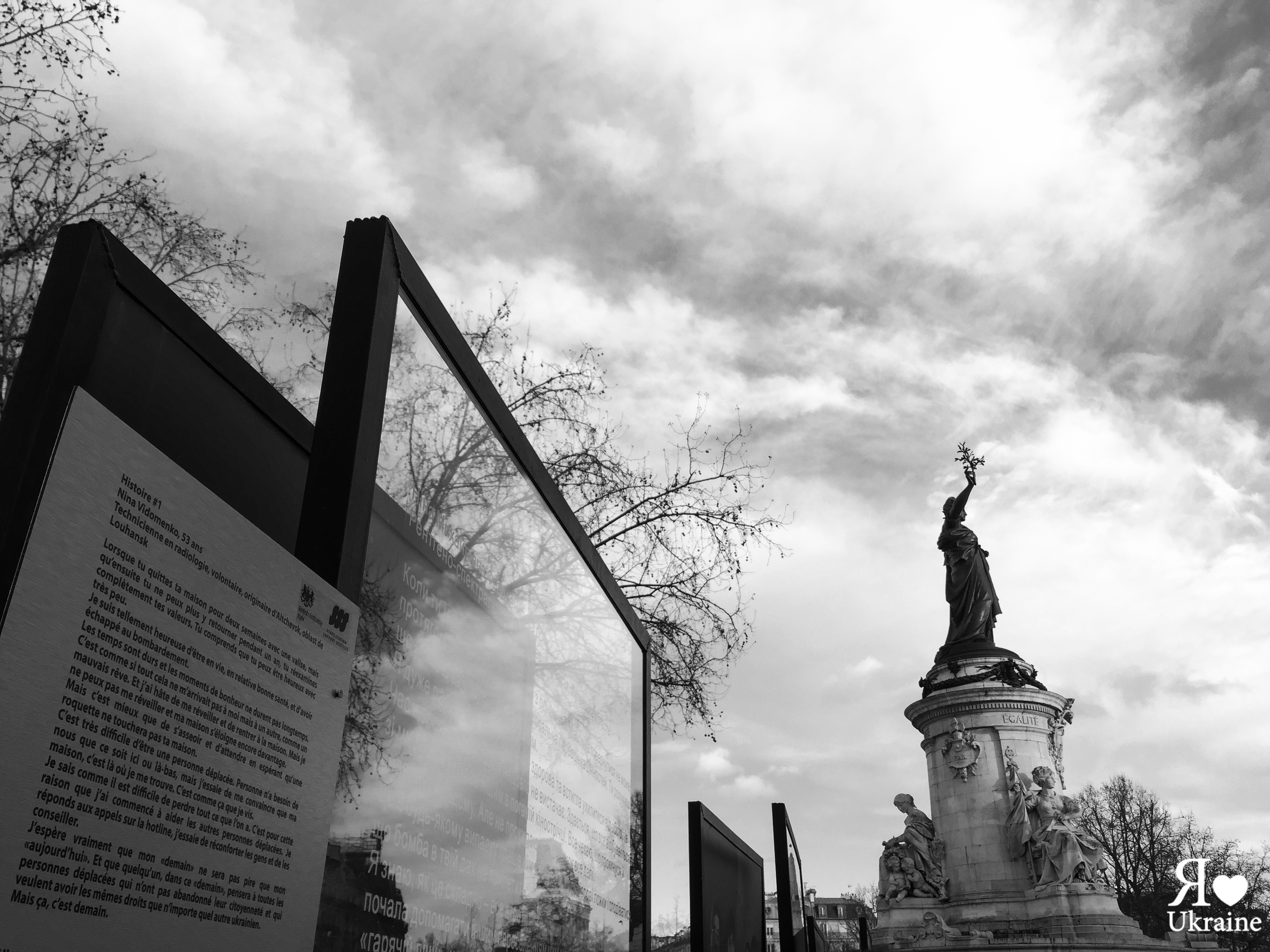 Aujourd’hui, à la symbolique place de la République il y a eu du vent, beaucoup de vent. Mais il y a eu aussi ces photos imposantes qui lui résistaient. Exposées derrière les murs de mots en plexiglass, ces photos nous parlent. Guerre, aide des volontaires, pourquoi, pays, maison, obligé, immigré, partir, comment vivre, famille, demain, espoir, bombardements. Des gens forts et leurs familles, un peu perdus, contraints de vivre et de reconstruire leurs vies, sans le demander… Déplacés, abandonnés, rejetés. Pas toujours facile de lire leurs mots sans avoir des larmes aux yeux, peut-être, suis-je juste trop sensible…
