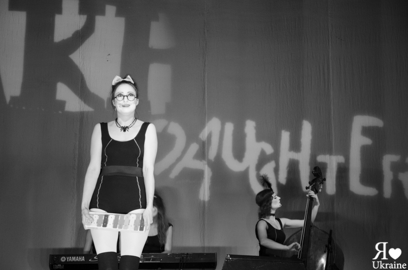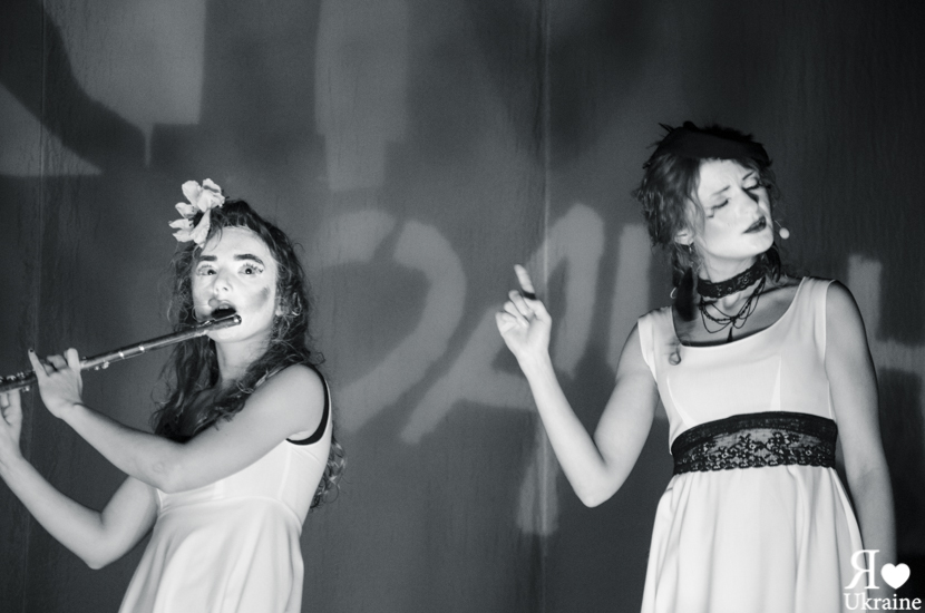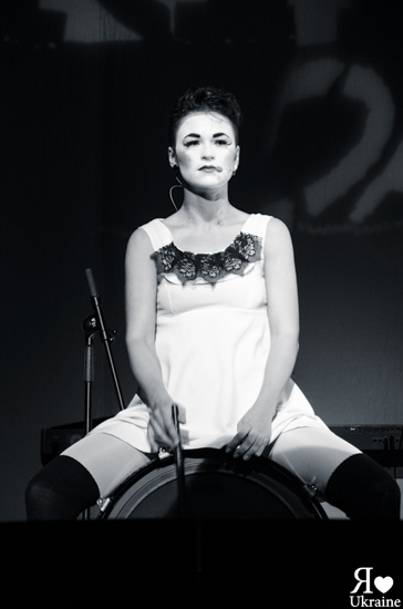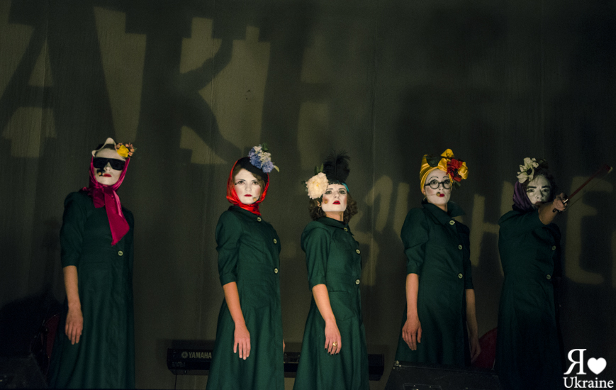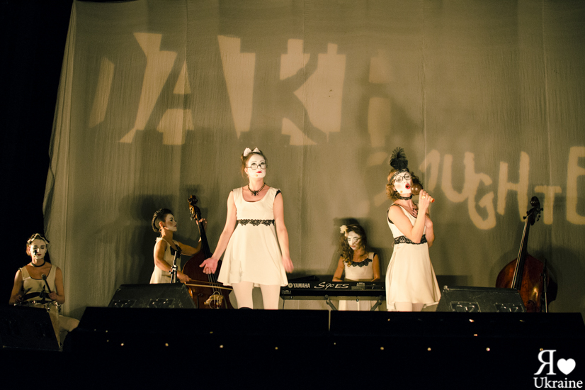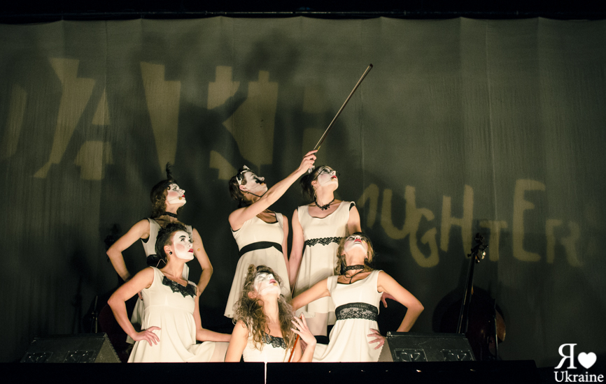 Dakh Daughters, c’est 7 jeunes femmes talentueuses, 7 grâces, 7 actrices, 7 musiciennes, 7 personnalités impressionnantes et 15 instruments musicaux. C’est Nina Garenetska – « DakhaBrakha » band (absente lors du concert en octobre), Ruslana Khazipova – « Perkalaba » , Tanya Hawrylyuk – projet solo « TanyaTanya », Solomiia Melnyk – projets « Powerful Women » et « Soloma project », Anna Nikitina – projet « Chanson Cabaret », Natalia Halanevych et Zo – ballet « BiZoN ». Tout d’abord, elles sont toutes actrices du théâtre Dakh de Vlad Troïtskiy, donc chaque concert des filles est une performance visuelle en plus.