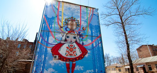 Le 16 avril dernier, Julien Malland a présenté son dessin de motanka sur la façade d’un bâtiment à Kharkiv en Ukraine. Ce jeune illustrateur, graphiste, directeur de la maison d’édition Wasted Talent est également présentateur et auteur des documentaires Globe-painter de la série Les Nouveaux Explorateurs diffusé sur Canal+. Il y a quelques années, il a déjà parcouru le monde dans l’intention de partager des expériences artistiques avec des street-artists issus de cultures différentes et il s’ouvre ainsi à de nouvelles manières de vivre et de pratiquer la peinture urbaine. Et ce n’est pas la première fois qu’il visite l’Ukraine: en 2012, il a consacré un épisode des Nouveaux Explorateurs au street art ukrainien.
