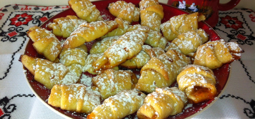 Les rogalykys. Diviser la pâte en 4 morceaux. Prenez chaque morceau et rouler-le en cercle. Couper le cercle en 12 triangles. Déposer une cuillère à café de confiture sur la partie large du triangle et faire rouler le triangle de sorte à garder la confiture à l’intérieur. Ainsi vous obtiendrez la forme de rogalyk.