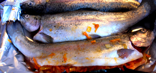 2. Préparez le poisson en le vidant. Salez et poivrez. Ensuite, farcissez les truites avec le mélange de carottes/oignons. N’en mettez pas beaucoup, pour que cela ne déborde pas trop.