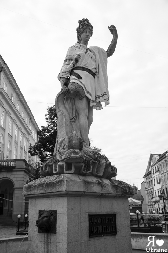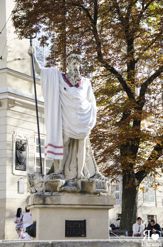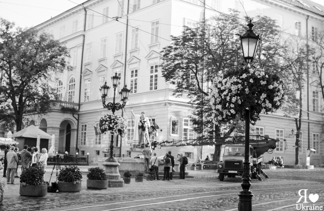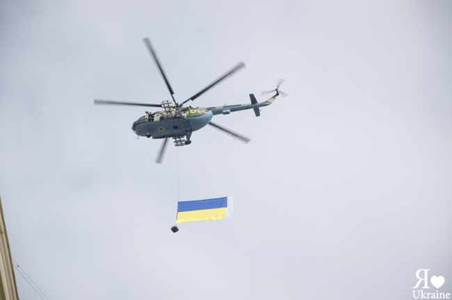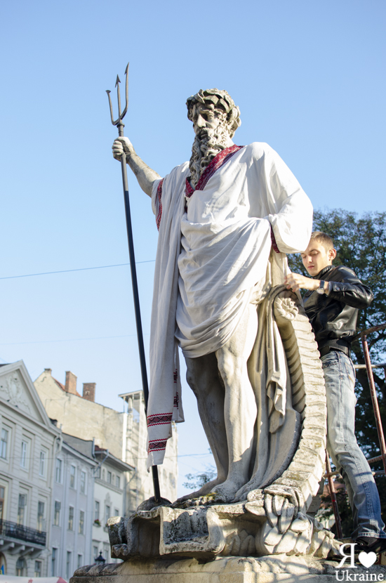 Le 24 août 2013, l’Ukraine a fêté son 22e anniversaire de la proclamation d’Indépendance. J’ai passé le 23 août, la Journée de drapeau national, à Lviv, où le plus grand drapeau a survolé le centre-ville attaché à un hélicoptère. Les 4 statues de la place Rynok ont été décorées de chemises brodées nationales, de fameuses vichivanka.