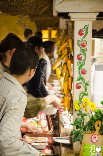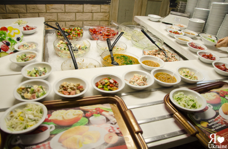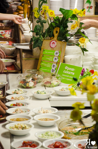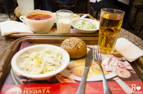 Commençons donc par l’incontournable chaîne de restauration, Pouzata Hata (Maison bedonnante) que vous trouverez un peu partout en Ukraine. A Kyïv il y en a 12! C’est de la bonne cuisine self service, fraîchement préparée, variée, pas chère, rapide. Ouvert toute la journée non stop (certains restaurants vous accueillent de 7h à 23h!), vous avez du choix entre multiples salades et entrées, plats chauds, borchtch ou autres soupes, desserts, boissons,…