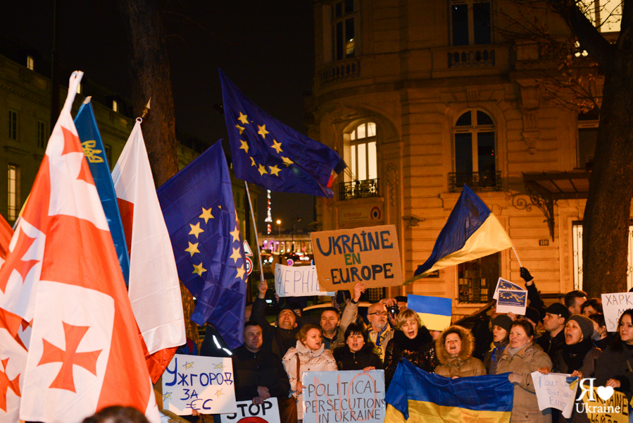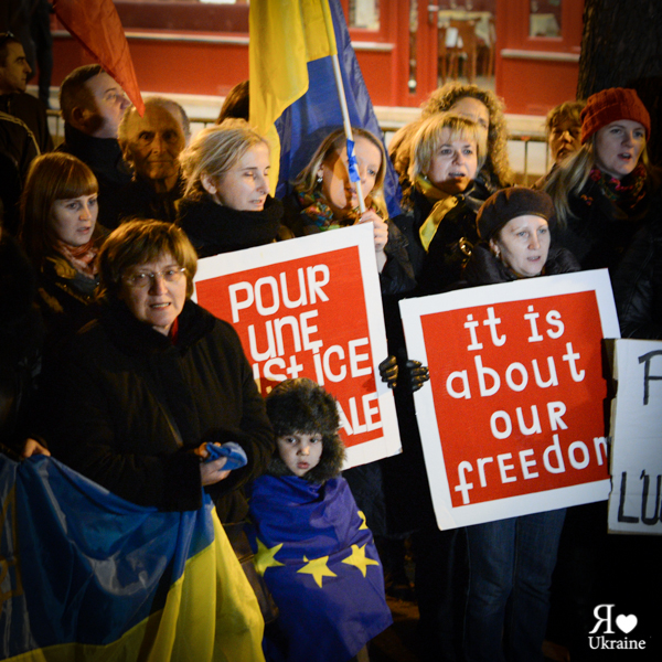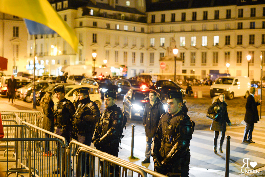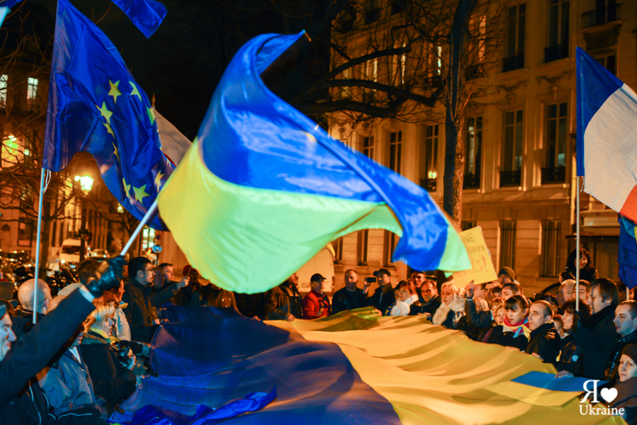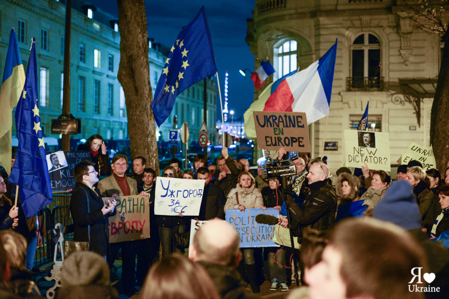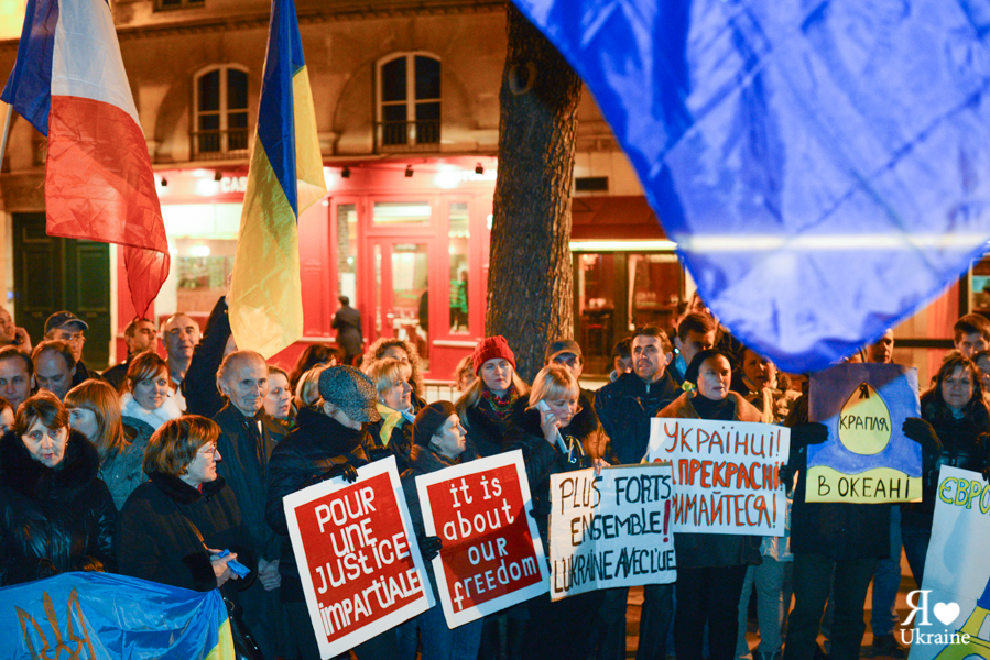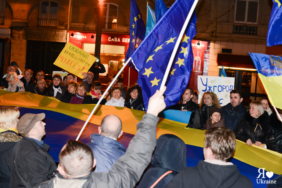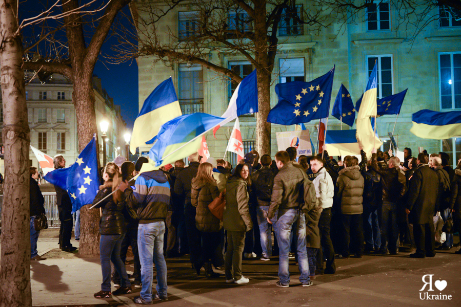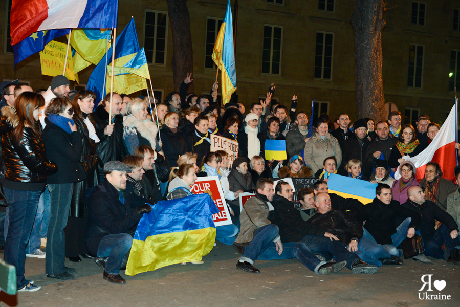 Dans une ambiance très amicale les Ukrainiens et ceux qui sont venus les soutenir criaient « L’Ukraine c’est l’Europe », « Celui qui saute, va dans l’UE », « l’Ukraine avec la Russie » (les Ukrainiens ont exprimé leur souhait pour que la Russie organise leur propre maïdan sur la place Rouge), « La France avec nous », « Kharkiv (Donetsk, Lugansk, Ternopile, Lviv, Doubno, Ivano-Frankivsk, Kyiv, Odessa) nous sommes avec vous », « Est-ouest ensemble », « Berkut avec le peuple » et d’autres.