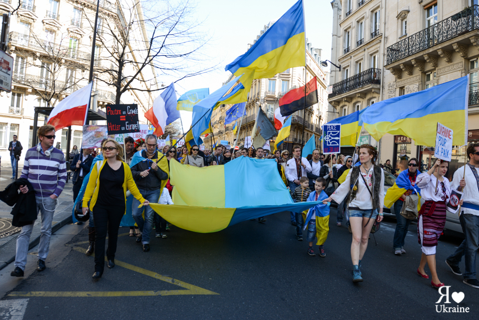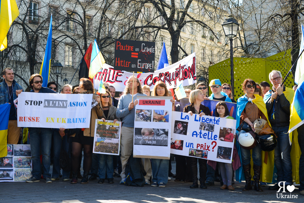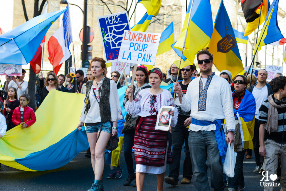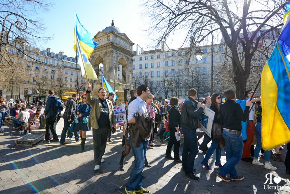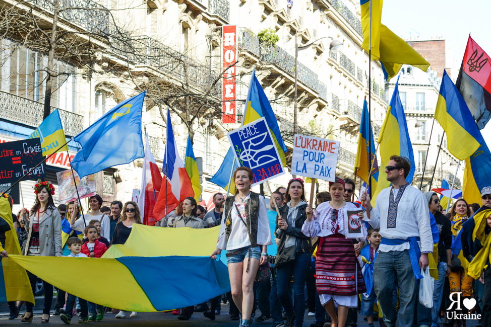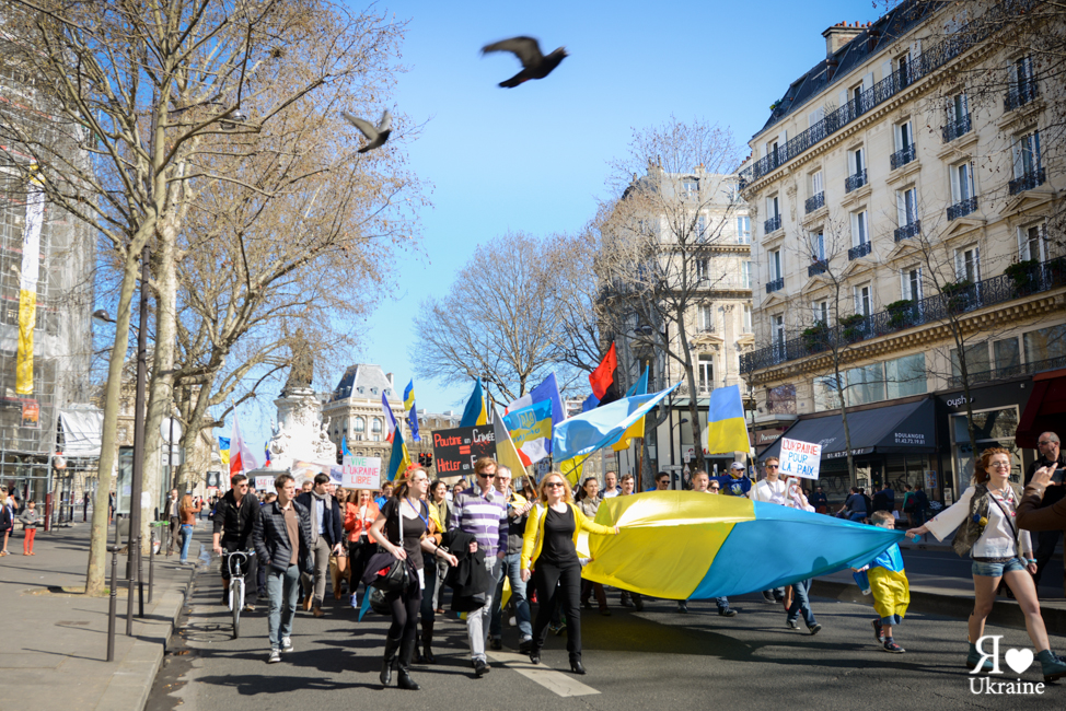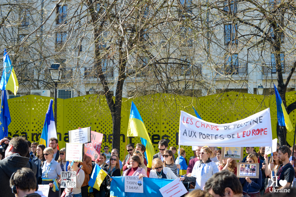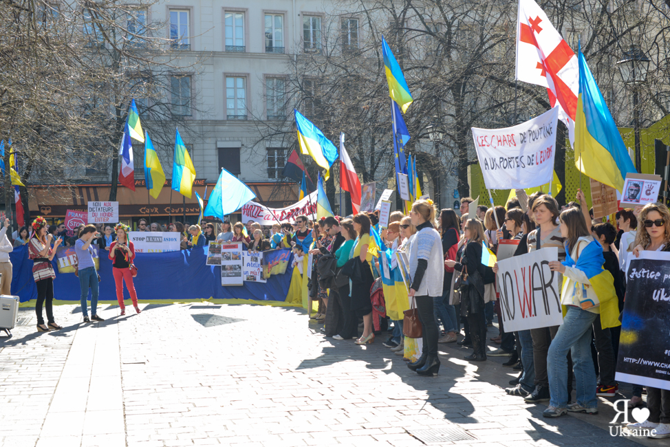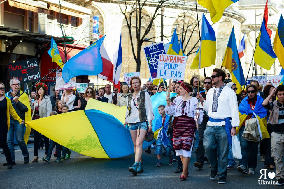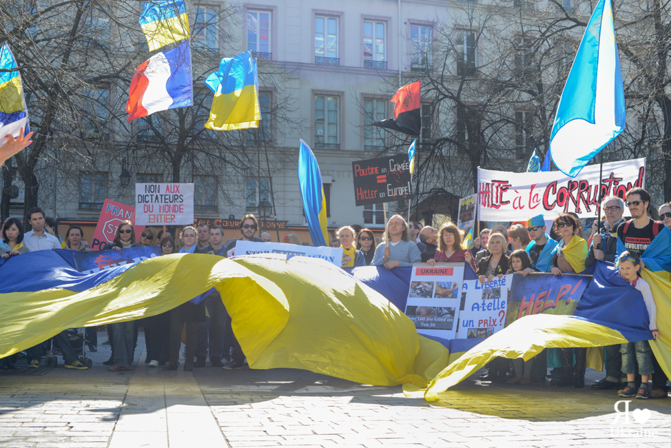 Aujourd’hui les parisiens d’origine ukrainienne et ceux qui sont venus les soutenir se sont rassemblés place de la République pour un cortège afin de s’exprimer contre le référendum illégal en Crimée, le régime poutinien et la paix en Ukraine.