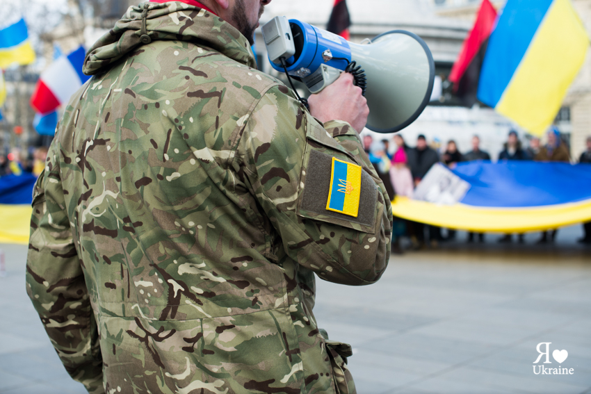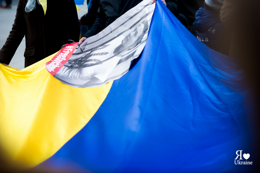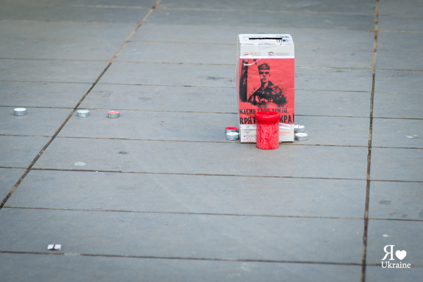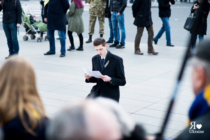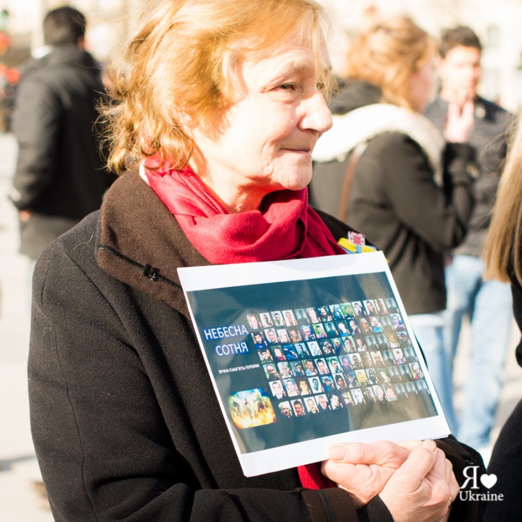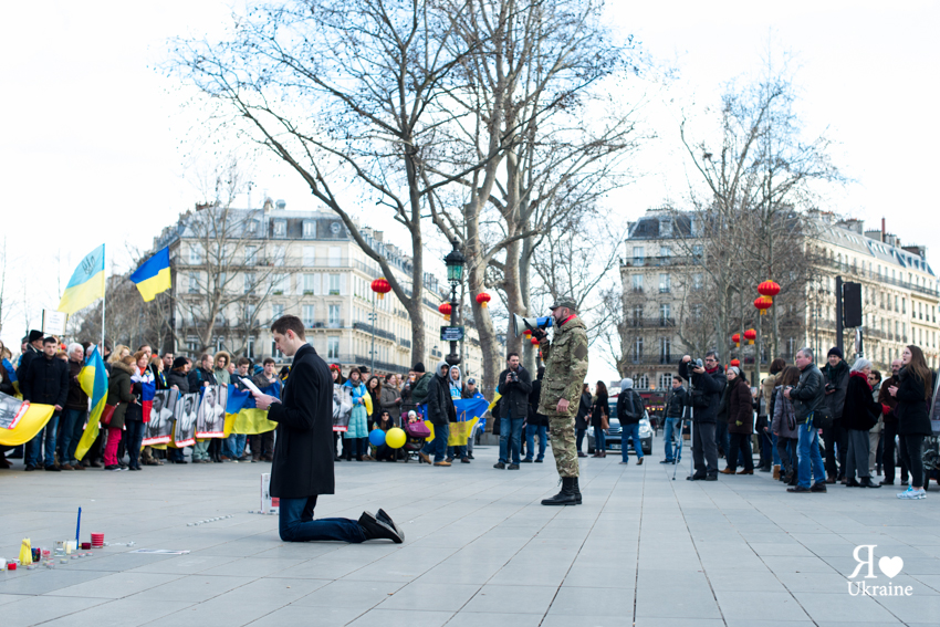 Les manifestants ont commémoré les victimes de la révolution ainsi que les soldats et les civils décédés durant la guerre à l’est. Le président de l’Association des étudiants ukrainiens en France a lu, agenouillé, les noms de tous les morts de Maïdan ainsi qu’un petit résumé consacré à chaque personne.
